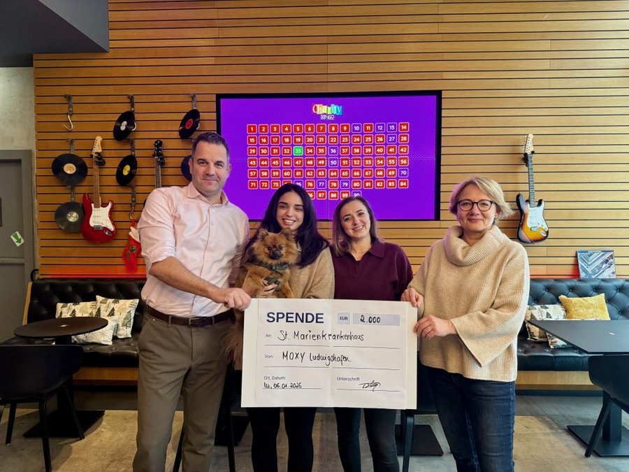 Ludwigshafen. Spielen und Spaß haben für den guten Zweck, das ist der Hintergrund, für die regelmäßig stattfindenden Bingo-Abende im Moxy Ludwigshafen. Bei dem beliebten Glücksspiel ist Spannung garantiert. Zusätzlich steht die Unterstützung von kranken Kindern im St. Marien- und St. Annastiftskrankenhaus für die Veranstalter im Fokus. Die stolze Summe von 2.000 Euro konnte jetzt Hoteldirektor Milan Sabic gemeinsam mit seiner Stellvertreterin Helena Kerliz und Mitarbeiterin Mayssa Ben Hassine an die Fundraisingbeauftragte Kathleen Groll übergeben. Die beim Bingo eingespielten Erlöse hatte das Hotel dafür noch einmal großzügig aufgerundet.