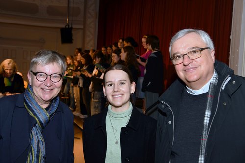 Die Autorin des Berichts Mia Alana Melber mit Bischof Karl-Heinz Wiesemann und Kirchenpräsidentin Dorothee Wüst.
