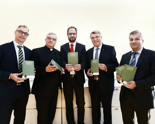 Stellten gemeinsam den ökumenisch-geistlichen Übungsweg vor: Pfarrer Dr. Steffen Schramm vom Protestantischen Institut für kirchliche Fortbildung, Bischof Dr. Karl-Heinz Wiesemann, Pastor Dr. Jochen Wagner, Vorsitzender der Arbeitsgemeinschaft Christlicher Kirchen, Region Südwest, Kirchenpräsident Christian Schad und der Ökumenereferent des Bistums Dr. Thomas Stubenrauch.